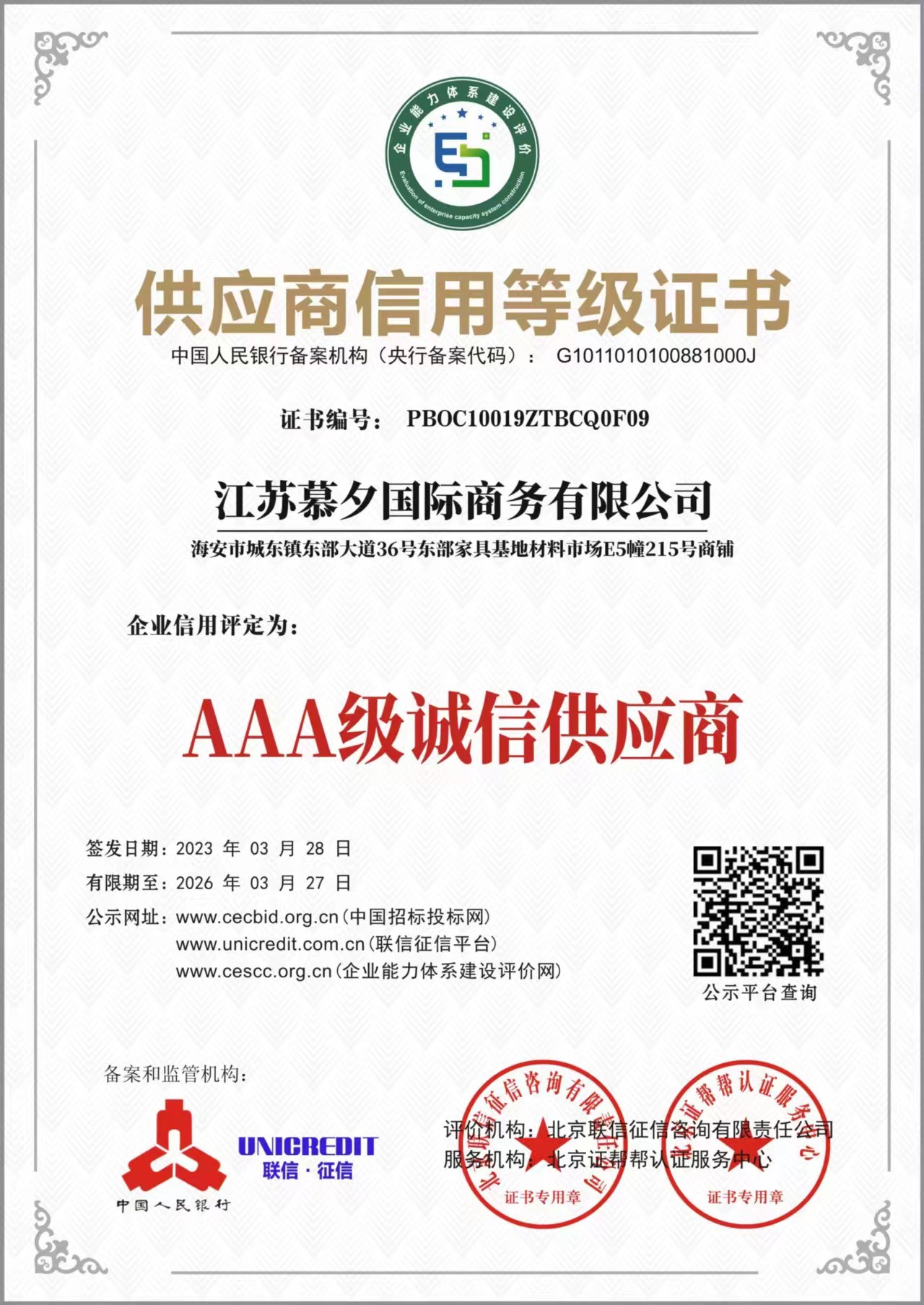 供应商信用等级证书