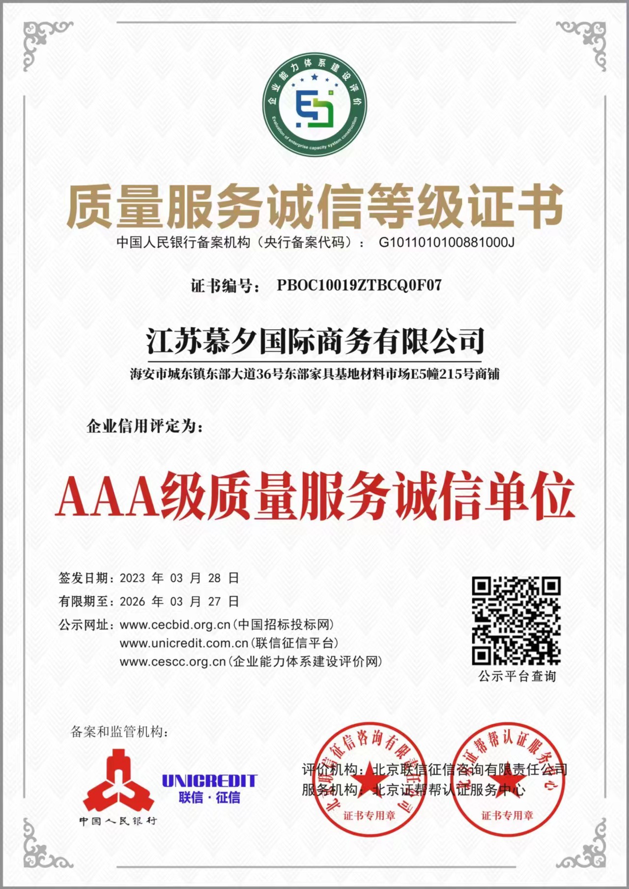 质量服务诚信等级证书