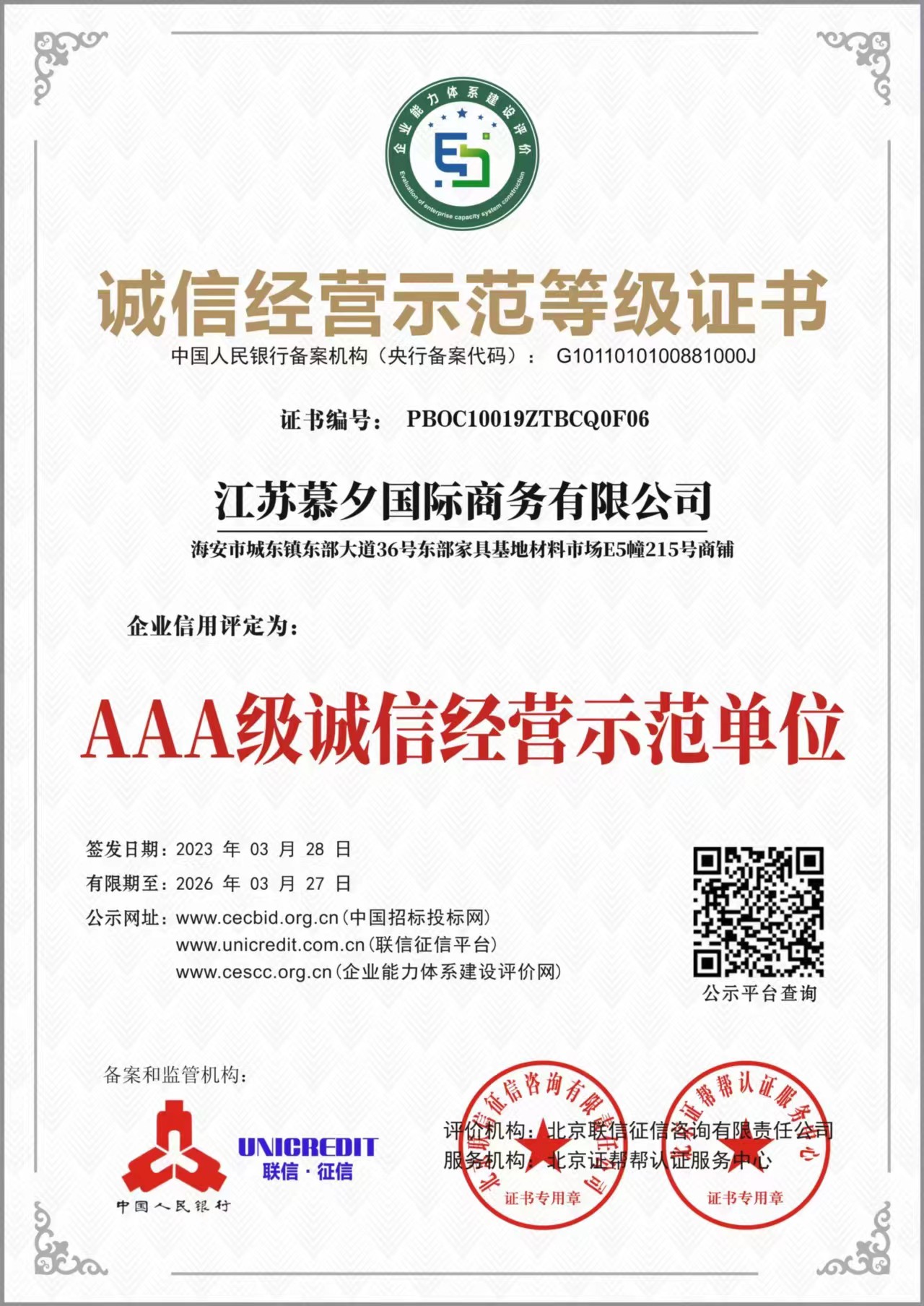 诚信经营示范等级证书